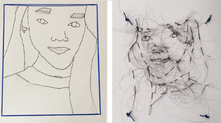 Untitled self portrait, front and back of panel embroidered with thread handmade from artist’s pandemic-length hair by Kaitlin Hyun